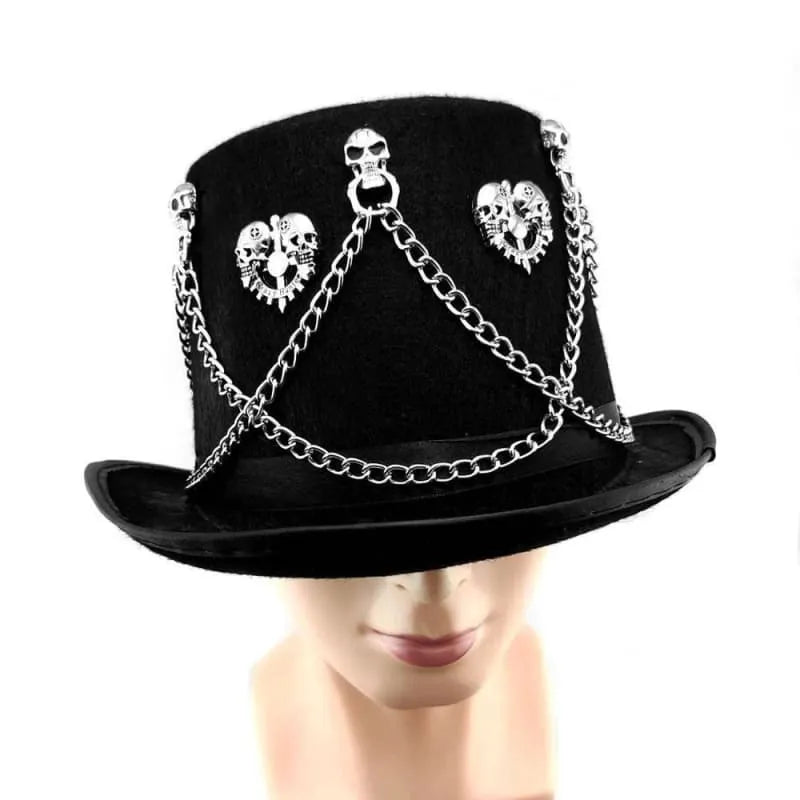 Item type: Steampunk hat Gender: unisex One size fits all Composition: polyester, zinc alloy (chains) Height: 20cm / 7,8"