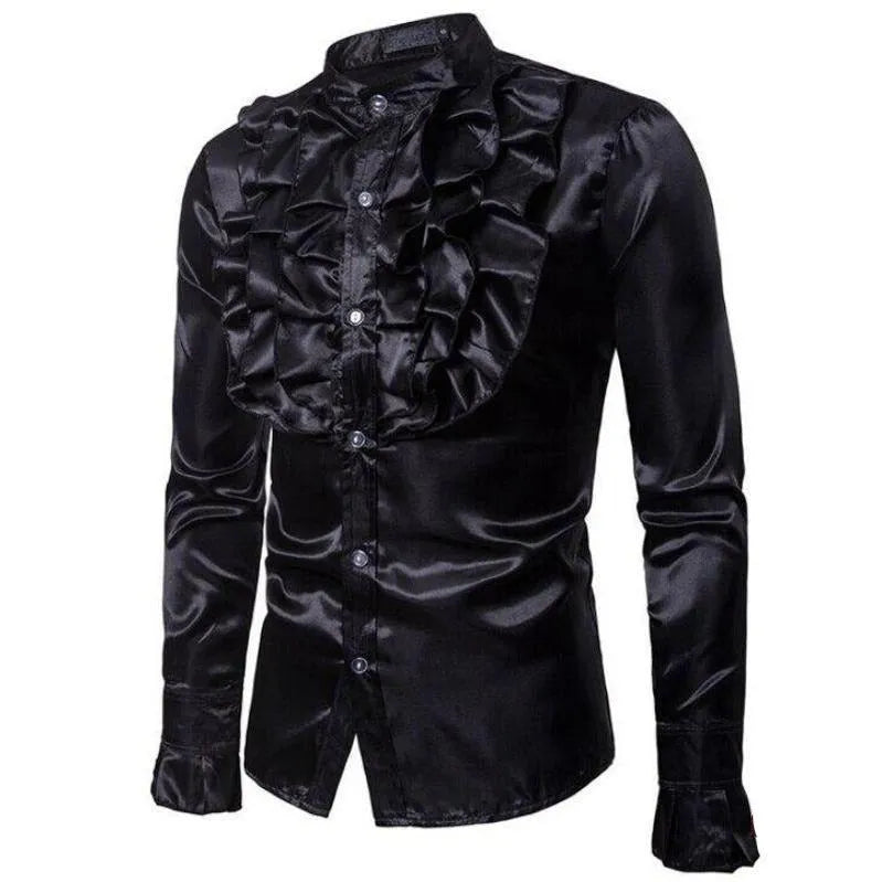 Express your taste for gothic style while looking chic and slightly casual with this high-quality black satin shirt for men.