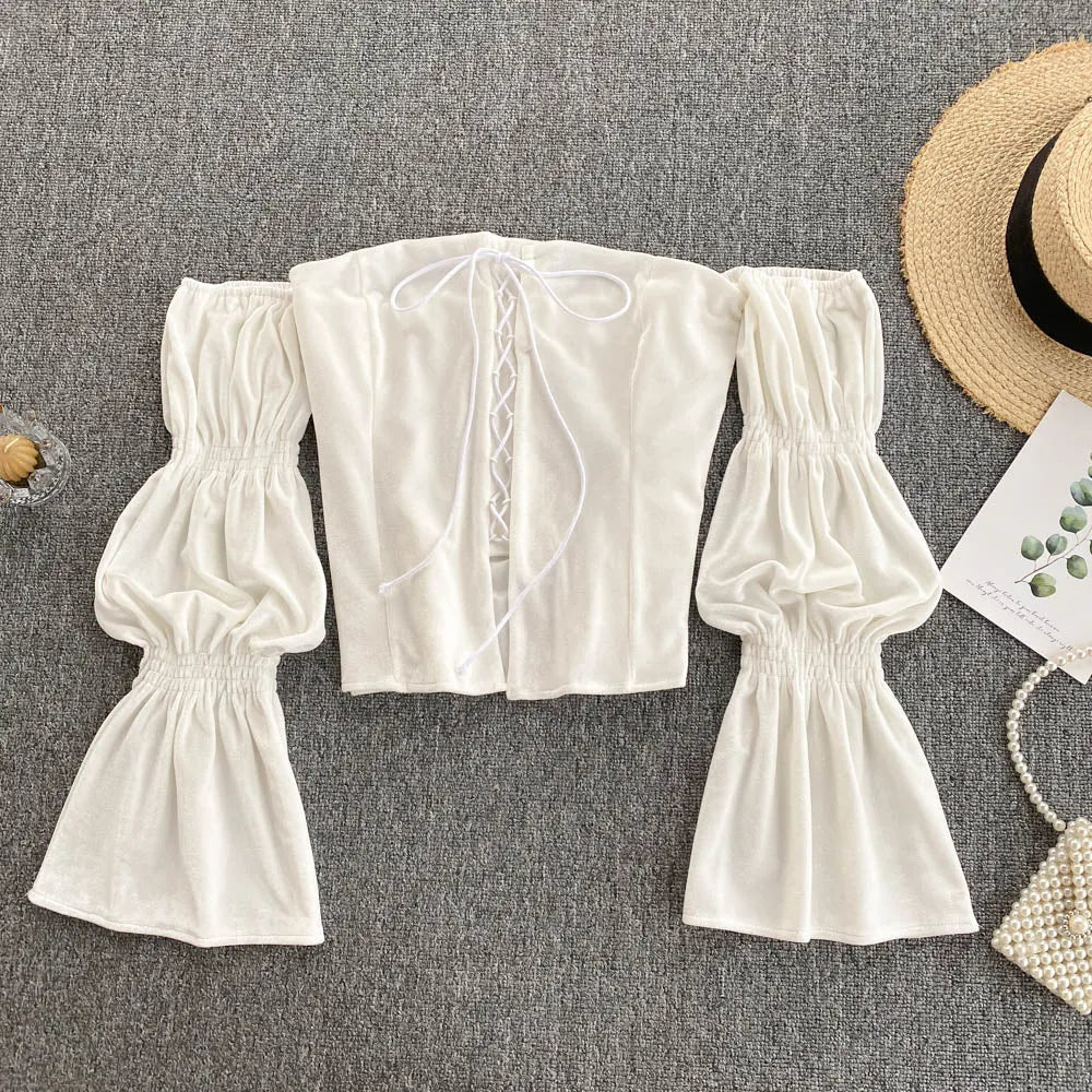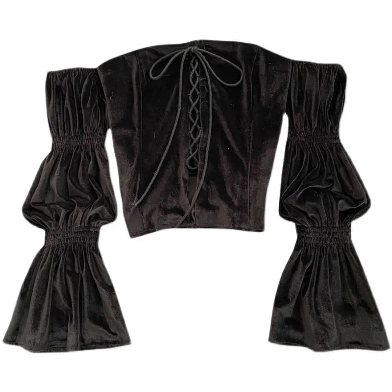 Its wide neckline with elastic fabric allows good support on the shoulders for a very retro look. It has a rope on the front and the elastic fabric at the waist gives a nice curved effect, the end of the sleeves are in leather. A great top for the vintage look lovers!