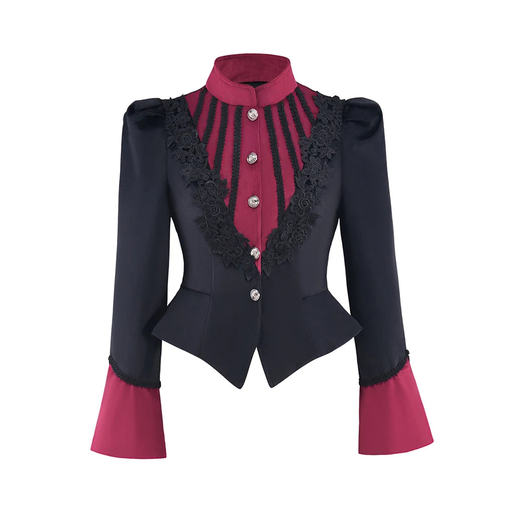 This Steampunk-style jacket combines Victorian elegance with a structured, feminine silhouette. Designed to accentuate the waist and shoulders, it features refined lace details, decorative buttons, and contrasting panels that instantly elevate any steampunk or gothic-inspired outfit. A perfect statement piece for cosplay, themed events, or bold everyday fashion.