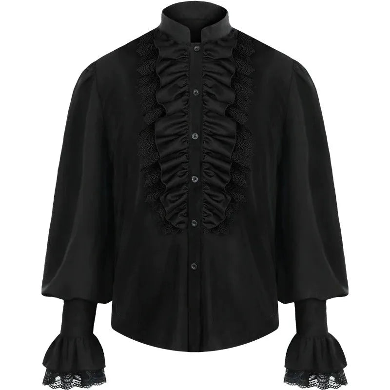 The finishing touches of this elegant top impeccably respect the design of Renaissance and musketeer men's shirts. The lace-up ruffle neckline and long sleeves with ruffled cuffs recall the cut of Victorian clothing with great distinction.